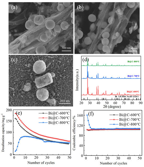 SEM images of (a) Bi@C-600 °C, (b) Bi@C-700 °C, and (c) Bi@C-800 °C; comparison of (d) XRD, (e) desalination capacity, and (f) Coulombic efficiency of materials at different sintering temperatures.