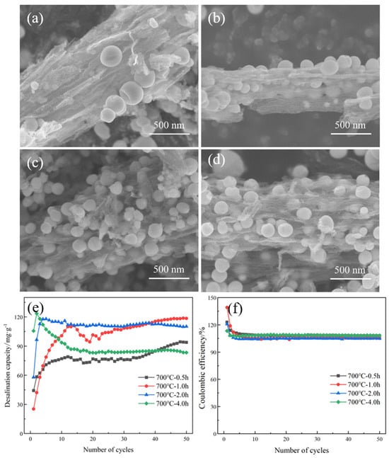 The shorter the sintering time, the smaller the size of the Bi ball, but the thickness of the carbon shell will be larger, thus preventing the contact of chloride ions with the Bi metal particles. However, too long of a sintering time will also cause the Bi particles to gradually gather and increase in size, which will lead to a reduction in the desalt capacity and life of the electrode. XRD tests were performed to determine the phase composition of the material, and the results are shown in Figure S1. The main diffraction peaks of Bi@C-2 h all corresponded to the Bi standard map, which proved that the ideal material could be successfully synthesized under the condition of a sintering time of two hours, and the heterogeneous peaks of the Bi oxide were more obvious in the material under the other sintering times, representing the incomplete thermal reduction of Bi. It can be seen from the SEM image that the Bi ball particles at Bi@C-0.5 h (Figure 2a) were spherical–concave with irregular distribution. The reason was that the annealing time was short and most of the Bi metal particles were covered in carbon shells, which could not be observed in the figure. For Bi@C-1 h (Figure 2b), the Bi metal particles coated in the carbon shell could be seen faintly. The size distribution of the Bi metal particles was wide, with the minimum visible particle size being 50 nm and the maximum particle size being 210 nm. However, most of the Bi particles were still coated and the particle size could not be determined. The carbon skeleton of Bi@C-2 h (Figure 2c) was pod-like and covered with Bi spherical particles. The particles were round, the carbon skeleton was thin, and the coated Bi particles were clearly visible. The particle size ranged from 50 to 180 nm, with an average particle size of 120 nm. On the other hand, the Bi spheres in Bi@C-4 h (Figure 2d) were basically exposed on the surface of the carbon skeleton, and the particle size mainly ranged from 70 to 220 nm, with an average particle size of 148 nm. At the same temperature and sintering time of 2 h, the particle size of the product was smaller and more uniform.