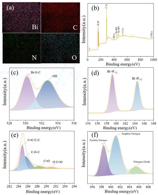 (a) EDX elemental mapping and (b) XPS spectra of Bi@C-2 h; (c) high-resolution Bi 4f XPS spectra of Bi@C-2 h; high-resolution 1 s XPS spectra of (d) C, (e) O, and (f) N of Bi@C-2 h.