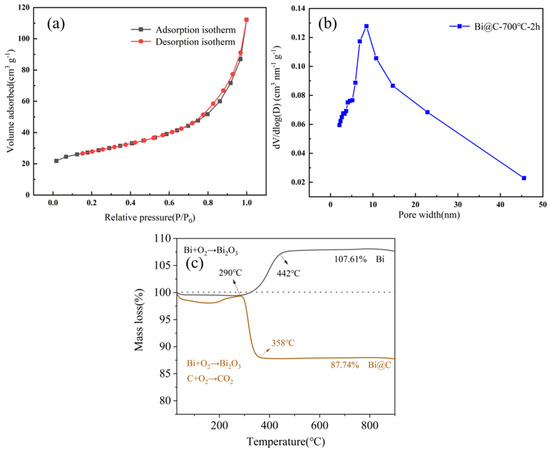 (a) Nitrogen absorption and desorption curves of Bi@C-2 h; (b) differential pore size distribution curve of Bi@C-2 h; (c) thermogravimetric curve of Bi@C-2 h and Bi metal.