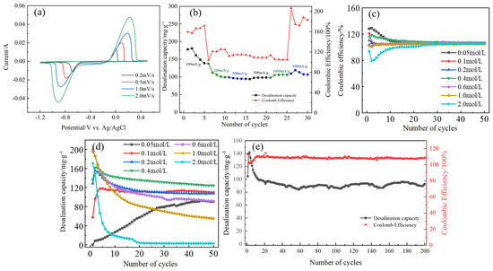 It can be seen from Figure 5c that when the electrolyte concentration was lower than 0.05 mol/L, the initial capacity of the electrode material was very low during the desalination cycle. When the electrolyte concentration was higher than 2 mol/L, the initial capacity of the electrode material was high, but after 20 cycles of charge and discharge, the capacity decayed to almost 0. When the electrolyte concentration was between 0.1 and 1 mol/L, the maximum desalination capacity of the Bi-carbon electrode material increased with the increase in the electrolyte concentration and stabilized at 90 to 120 mg/g after 50 cycles. When the electrolyte concentration was 0.2–0.6 mol/L, the electrode material exhibited the best cycling performance. As can be seen from Figure 5d, with the stability of the reaction, the Coulombic efficiency of the Bi@C at different concentrations was finally around 105%, with a low side reaction degree and high energy utilization rate.