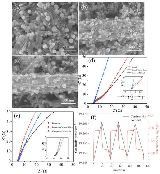The change of electrical conductivity during charge and discharge is shown in Figure 6f. The discharge process of the electrolytic cell corresponded to the conversion of Bi stored chloride into Bi oxychloride, which was consistent with the decreasing trend of the electrical conductivity of the solution. However, during the charging process of the electrolytic cell, Bi oxychloride released chloride ions and reduced to Bi, and the chloride ions in the solution increased, and the conductivity increased. Because the applied current was a constant current, the conductivity of the electrolyte also showed a linear change with the increase in time, which proved that the current input was used by the electrode chloride-storage process. Therefore, in the process of charging and discharging, the removal of chloride ions occurred in the Bi@C electrode, which led to the change in electrical conductivity.