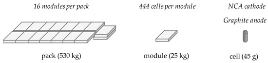 Lithium-ion batteries (LIBs) can consist of different compositions, but they can also be of many sizes and shapes. LIBs usually have the same arrangement, which is packs, modules, or cells (Figure 1). A LIB pack usually consists of several modules. The modules are arranged in series, with the pack providing the housing for the modules and the modules providing the housing for the cells. The pack and modules also contain additional components. The cells are arranged in series and parallel in the module [8]. The structure of the battery cells can be of diverse types, and the most used are cylindrical, prismatic, and pouch cells. A simplified schematic description of a lithium-ion battery pack, a Tesla Model S 85 kWh battery pack made of cylindrical cells, is shown in Figure 1.