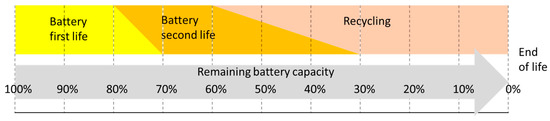 When an EV battery has reached the end of its first life, which has been suggested to occur when 70–80% of the original capacity is left, there is a possibility to repurpose it and give it a second life in other applications. Figure 2 portrays the stages in the life of an EV battery and at what battery capacities these are expected to occur. It is still not clearly defined when the end of the battery’s second life occurs. However, suggestions of 30% [13,18] or 50–60% [19] have been put forward. Several applications for SLBs have been proposed. These include, for example, stationary energy storage in microgrids [20], power peak-shaving applications [21], and grid energy arbitrage [22]. Common characteristics of these operations are lower power or specific energy requirements. Other potential non-stationary second-life operations can be micro-mobility applications such as e-scooters and industrial vehicles such as various electronics and forklifts [23].