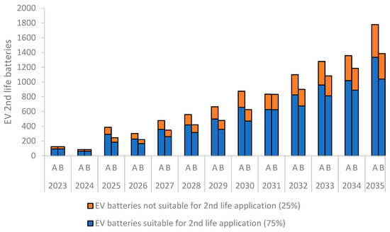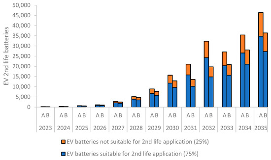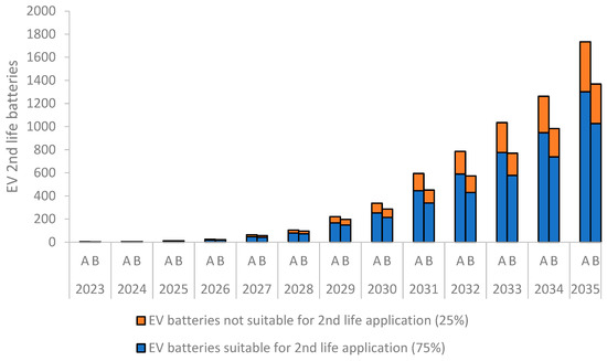 The estimated availability of Second-Life Batteries in Ostrobothnia. A—10-year EV lifespan; B—16-year EV lifespan.