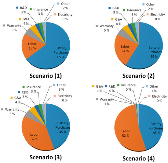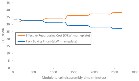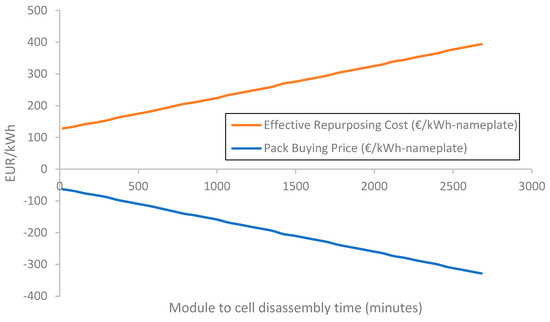 Besides the time spent processing and testing the batteries, the disassembly time must be considered when the batteries are processed at the module or cell level. The time required for disassembling the battery packs at the module and cell level is listed in Table 5. The disassembly time for a Tesla Model S battery pack was calculated based on estimates provided in [62]. The estimated time to disassemble the Tesla Model S battery module was obtained from work in the project “Developing Battery 2nd-life Business in Ostrobothnia” [63], where a Tesla Model S battery module was partly disassembled at the cell level. As a result of this work, it was found that the disassembly of a Model S battery module is extremely time-consuming. The time estimate arrived at in this project, 2680 min, is much greater than the theoretical estimate of 20 min calculated based on information from Lander et al. [62]. The cells are difficult to remove as they are glued to the plastic chassis of the module. Care must be taken while disassembling so as not to damage the cells.