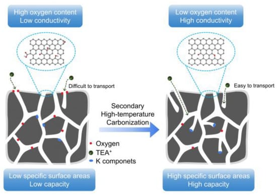 Based on the previous research, enlarging the voltage window and increasing capacitance are both effective to improve the energy density of SCs [9,10]. Chang et al. [11] reported a frame-filled C/C composite with coal tar pitch and natural flake graphite as raw materials, showing both a high specific surface area and electrical conductivity. When tested in the TEABF4 in the PC electrolyte (3 V) and medium pure EMIMBF4 electrolyte (3.5 V), the C/C composite exhibited both high gravimetric and volumetric capacitances. Moreover, it displayed a high energy density as high as 66.3 Wh kg−1. Similarly, Leng et al. [12] synthesized a three-dimensional carbon framework (3DCF) under H2/Ar at high temperature, with a high specific surface area and good conductive network, exhibiting both ultra-fast and high charge storage. Dead leaves of Ginkgo biloba were used as the precursor to prepare activated carbon by using different activating agents [13]; the carbon activated by KOH showed the highest specific capacitance of 374 F g−1 at a current density of 0.5 A g−1. Further, the energy density can reach 9.2 Wh kg−1 at a power density of 48 W kg−1. Compared to SCs with the aqueous electrolyte working within 1 V, organic electrolyte-based SCs provide a wider voltage range of 2.5–2.7 V, contributing to the higher energy density of SCs [14]. However, organic electrolytes always consist of large-sized ions, resulting in sluggish ion diffusion [15]. Therefore, the preparation of electrode materials with both plentiful energy storage active sites and rapid transport rates for large-size ions is crucial for the higher energy density of SCs. Improving specific surface areas (SSAs) of electrode materials is one effective method to enhance the ion transport rate because it can expose more active sites for the rapid physical adsorption of TEA+ ions [16,17]. In addition, according to the definition equation of capacitance: , the increase in SSAs can help increase the capacitance.