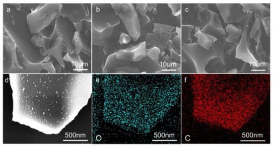 SEM images of (a) HTC-0, (b) HTC-1000, (c) HTC-1100, (d) SEM image of HTC-1000, (e) O mapping of HTC-1000, (f) C mapping of HTC-1000.