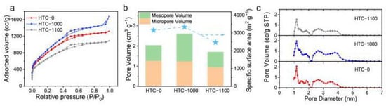 (a) N2 adsorption-desorption isotherms, (b) porous structure evolution and specific surface area, and (c) pore size distributions of HTCs.