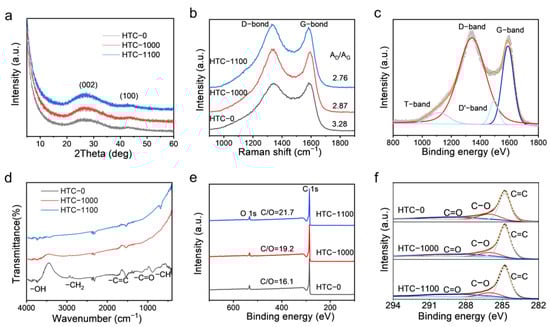 (a) XRD patterns and (b) Raman spectra of HTCs. (c) Raman fit plot of HTC-1000, (d) FTIR spectra, (e) XPS survey spectra, and (f) high-resolution XPS C 1s spectra of the HTCs.