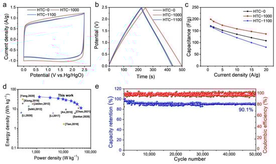 To evaluate the electrochemical performance of HTCs, GCD, CV, rate performance, and cyclic stability, tests were conducted [47]. The active mass loadings of electrodes were 2.0 mg cm−2. CV tests are carried out from 0 to 2.5 V at the scan rate of 10 mV s−1, and the CV curves of HTC-0, HTC-1000, and HTC-1100 are all rectangular-shaped, indicating good double-layer capacitance behavior (Figure 5a). Compared with HTC-0 and HTC-1100, HTC-1000 shows a larger area at the same current, indicating a higher capacitance. The excellent energy storage properties of HTC-1000 benefited from its larger SSAs and more abundant pore distribution, which can provide sufficient active sites. Moreover, the CV tests were carried out at a series of scan rates of 20, 50, 100, and 200 mV s−1. From Figure S5, the shape of CV curves is maintained well, indicating the good stability of HTC-1000. GCD tests were conducted and based on the equation (m is the active mass loading on the single electrode), and HTC-1000 exhibits a high capacitance of 199.2 F g−1 at 1 A g−1, which is higher than the 170.4 F g−1 of HTC-0 (Figure 5b). When the current densities increase to 2, 3, 4, 5, and 10 A g−1, HTC-1000 exhibits a high capacitance of 189.8, 182.9, 177.9, 173.6, and 158.2 F g−1, respectively. In addition, the GCD curves of HTC-1000 exhibit a standard isosceles triangular shape, meaning that there is no redox reaction in HTC-1000, resulting in the fast charge-discharge capability [48]. As shown in Figure 5c, HTC-0 exhibits a specific capacitance of 170.4 F g−1 at 1 A g−1 and a specific capacitance of 107.5 F g−1 at 20 A g−1, with a capacity retention ratio of 62.9%. After secondary high-temperature treatment, HTC-1000 displays a high specific capacitance of 199.2 F g−1 at 1 A g−1. In addition, the capacity retention ratio of HTC-1000 at 20 A g−1 increases from 62.9% to 68.3%, with a specific capacitance of 136.3 F g−1 (Table S3). The improved capacitance and rate performance benefit from the increased SSAs, abundant mesoporous, and excellent conductivity, which can provide more energy storage sites and promote the transport kinetics of ions and the conduction of electrons [49,50]. In addition, the commonly used YP-50F was also tested for comparing cycling stability. Compared with YP-50F, which displays a specific capacitance of 90.0 F g−1 at 1 A g−1 and 26.0 F g−1 at 20 A g−1, HTC-1000 has a significant advantage (Figure S6). As for HTC-1100, due to the excessively high temperature during secondary high-temperature treatment, some pores collapse and merge, resulting in a decreased specific capacitance of 168.0 F g−1 at 1 A g−1 and 80.0 F g−1 at 20 A g−1. Furthermore, the HTC-1000//HTC-1000 symmetric SCs were also assembled and measured at 1, 5, 10, 20, 30, 40, 50, 70, and 100 A g−1. According to the equation: , , the HTC-1000//HTC-1000 symmetric SCs exhibit an excellent energy density of 43.2 Wh kg−1 at the power density of 625.0 W kg−1, which is much higher than the other reported carbon material (Figure 5d, Table S5) [48,51,52,53,54,55,56,57,58,59,60]. Furthermore, the cycling performance of symmetric organic SCs assembled with HTC-1000 was tested at 5 A g−1. As shown in Figure 5e, even after as long as 50,000 cycles, the symmetric supercapacitor still maintains a high capacitance of 179.0 F g−1, with a high capacity retention ratio of 90%. The outstanding cycling stability of symmetric organic supercapacitors derives from the excellent structural stability of the electrode material and the few side reactions. SEM images of HTC-1000 after cycling for 50,000 cycles still maintain a blocky structure of 20–40 μm, which is in accordance with the pristine HTC-1000 (Figure S7). It shows that the electrode material can maintain the structural integrity during charging and discharging, thus improving the cycle stability. Under high pressure in the organic electrolyte, the -COOH groups and C-O groups are easily decomposed to produce H2O, CO2, CO, and other gas molecules, which can raise side reactions and affect electrode stability. Moreover, the oxygen-containing functional groups can react with the electrolyte and catalyze the decomposition of the electrolyte. Therefore, the removal of oxygen-containing functional groups can effectively hinder the occurrence of side reactions and enhance the cycling stability of electrode materials. In general, due to the excellent structural stability of the materials and the decrease in side reactions, symmetric organic supercapacitors assembled with HTC-1000 exhibit outstanding cycling stability.
