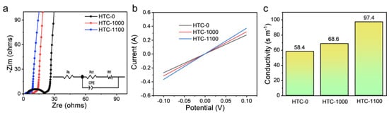 Electrochemical impedance tests were conducted to explore the ionic and electronic conductivity. According to the Nyquist plots of HTCs, HTC-1000 treated at high temperature exhibits better electronic transport efficiency and conductivity compared with HTC-0 (Figure 6a) [61,62]. To further analyze the effects of secondary high-temperature treatment on ionic conductivity and electronic conductivity, the Nyquist plots have been fitted and the corresponding equivalent electrical circuit diagram is shown in Figure S8. The electrode resistances obtained from equivalent circuits by fitting the experimental data of HTCs electrodes are shown in Table S4. According to the fitted data, the Rct of HTC-1000 and HTC-1100 are 5.7 Ω and 2.5 Ω, which are much lower than that of HTC-0 16.2. It shows that secondary high-temperature treatment can effectively improve electronic conductivity. As shown in Figure S9, the slope between Z′ and ω−1/2 represents the Warburg coefficient (σw). The slopes of HTC-0, HTC-1000, and HTC-1100 are 2.9, 2.7, and 4.1, respectively, indicating the highest diffusion coefficient of HTC-1000. This is because after secondary high-temperature treatment, the porosity of HTC-1000 is expanded and more mesoporous is formed. However, the high temperature of HTC-1100 leads to the collapse of pore structures, resulting in lower ion transport efficiency. To further verify the conductivity of the samples, we measured the I-V curves of the sample HTCs with an electrochemical workstation. From Figure 6b,c, it can be found that the conductivities of HTC-0, HTC-1000, and HTC-1100 are 58.4, 68.6, and 97.4 S m−1, respectively, which is consistent with the Rct results.