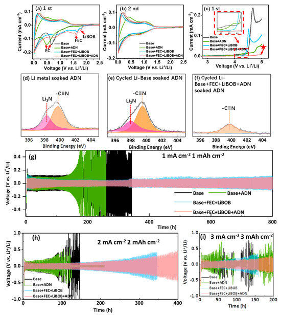 (a,b) The CV profiles of four electrolytes in Li/Super-P cells: (a) the first cycle; (b) the second cycle; (c) the LSV of four electrolytes in the Li/Super-P cells; (d–f) the N 1s spectrum of the Li anode soaked in an ADN solution by XPS: (d) fresh Li metal; (e) Li anode cycled in Base electrolyte; (f) Li anode cycled in Base + FEC + LiBOB + ADN electrolyte; (g–i) cyclic performances of the Li/Li symmetric cells in four electrolytes at different current densities and capacities: (g) 1 mA cm−2 and 1 mAh cm−2; (h) 2 mA cm−2 and 2 mAh cm−2; (i) 3 mA cm−2 and 3 mAh cm−2.