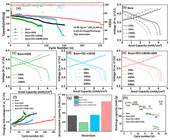 The cyclic performance was evaluated under 0.2 C charge and 0.5 C discharge between 2.8 and 4.3 V vs. Li/Li+, as shown in Figure 2a–e. The cells with the Base + FEC + LiBOB + ADN electrolytes present the highest capacity retention, retaining ~71.6% in the 250th cycle, which is significantly better than the samples of Base + FEC + LiBOB (129 cycles), the Base electrolytes (127 cycles) and the Base + ADN (80 cycles). Furthermore, the charging mid-capacity voltage of the cells with the Base + ADN electrolytes is the largest and increases faster than that of the other electrolytes, while the variation in the mid-capacity voltage with FEC and LiBOB is more stable than the Base (Figure 2f). The accumulated capacity of Li/LiNi0.8Co0.1Mn0.1O2 cells with Base + FEC + LiBOB + ADN electrolytes achieved a cumulative discharge capacity of ~ 653.36 mAh cm−2 with capacity retention ≈ 80%, while those of the Base, Base + ADN and Base + FEC + LiBOB electrolytes are 347.9, 194.6 and 360.0 mAh cm−2 (Figure 2g). These results demonstrate the usage of the ADN additive can boost the LIB’s electrochemical performance when appropriate anodic protective strategies are used; however, it seriously deteriorates the cells’ durability if no remedies are applied.