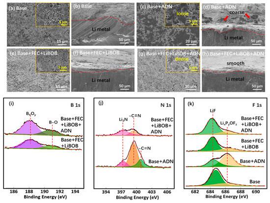 The chemical components on the cycled Li anode were detected via X-ray photoelectron spectroscopy (XPS) measurements. As shown in Figure 3i, there are two peaks pointing to boron and borate compounds at 188.3 and 191.0 eV in the B 1s spectra [18,19], which are probably derived from the LiBOB additive of the Base + FEC + LiBOB and Base + FEC + LiBOB + ADN electrolytes. In the N 1s spectra (Figure 3j), three peaks corresponding to Li3N, -CN and -C=N compounds at 398.2 [20], 400.1 [14] and 401.4 eV [21] can be clearly seen with the Base + ADN electrolyte, which should be generated from the decomposition of the ADN additive. However, with the multiple additives of FEC, LiBOB and ADN, the intensities of the -CN and Li3N peaks are much weaker. In the F 1s spectra (Figure 3k), two peaks relating to LiF and LixPyOFz at 684.6 and 686.6 eV can be seen in four electrolytes [22,23], but the ratio of LiF is less in the Base + ADN electrolytes than the other electrolytes. These results further indicate that the FEC and LiBOB additives can be decomposed to form an F- and B-enriched passivation layer, suppressing the decomposition of the ADN additive on the anode. In addition, in the C 1s and O 1s spectra (Figures S7 and S8), the inorganic Li2O and boron compound peaks can be seen in the electrolytes with FEC and LiBOB added; meanwhile, the -CN peak can be detected in the Base + ADN electrolyte. In the P 2p spectra (Figure S9), the intensities of the LixPyOFz and LixPFy peaks are much weaker in the FEC- and LiBOB-added electrolytes than in the Base + ADN electrolytes. These demonstrate that the passivation layers that evolved from the FEC and LiBOB suppress the decomposition of the PF6− anions.