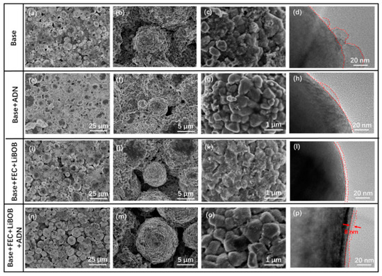 The SEM and TEM images of the 10 cycled LiNi0.8Co0.1Mn0.1O2 electrodes in four electrolytes: (a–d) Base electrolyte; (e–h) Base + ADN electrolyte; (i–l) Base + FEC + LiBOB electrolyte; (m–p) Base + FEC + LiBOB + ADN electrolyte; (d,h,l,p) the morphologies obtained using TEM.