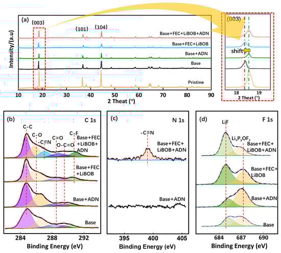 The structures of the LiNi0.8Co0.1Mn0.1O2 electrodes before and after 10 cycles were measured using X-ray diffraction (XRD) equipment. As shown in Figure 5a, the feature peaks of the (003), (101) and (104) layered oxide materials are clearly visible for the fresh and cycled electrodes. The (003) peaks of the cathodes cycled in electrolytes without ADN are slightly shifted to 18.4° from 18.6°; meanwhile, no change takes place in the electrodes cycled in ADN-containing electrolytes. The surficial components of the cycled LiNi0.8Co0.1Mn0.1O2 particles were detected with XPS. As shown in Figure 5b–d, the peaks of the -CN group located at 287.1 and 399.3 eV in the C1s and N1s spectra are observed in the Base + FEC + LiBOB + ADN electrolytes. In addition, the area ratio of the LiF in the F1s spectra is much higher than that in the Base and Base + ADN electrolytes and is slightly higher than that in the Base + FEC + LiBOB electrolytes. Due to their good stability at a high voltage, both the LiF and -CN groups are considered to be important components of CEI film for suppressing interfacial reactions. Moreover, in the O 1s and P 2p spectra, strong peaks of LixPyOFz in the Base and the Base + ADN electrolytes are detectable, implying the serious decomposition of the PF6− anions (Figure S12 and S13). There are weak peaks of B-containing compounds and strong peaks of Ni to be seen in the Base + FEC + LiBOB and Base + FEC + LiBOB + ADN electrolytes (Figures S13 and S14). These results indicate the ADN could effectively protect the cathode and suppress the decomposition of electrolytes when FEC and LiBOB are co-utilized together.