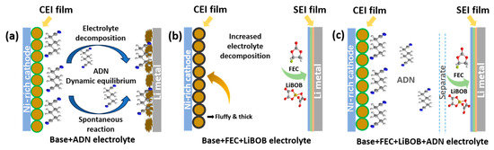 The schematics of the electrode/electrolyte interphases in Base + ADN, Base + FEC + LiBOB and Base + FEC + LiBOB + ADN electrolytes. (a) Addition of ADN to the base electrolyte promotes the formation of a thin CEI on the cathode side, but ADN severely erodes the Li metal anode and produces a large number of by-products, and ADN is also consumed in large quantities at the cathode; (b) the addition of FEC and LiBOB can form a three-layer composite SEI to protect the Li-metal anode, but the cathode side produces a fluffy and thick deposit; (c) when ADN and FEC and LiBOB are used simultaneously, a stable protective film can be formed on both sides, curbing the occurrence of the adverse reactions in (a,b).