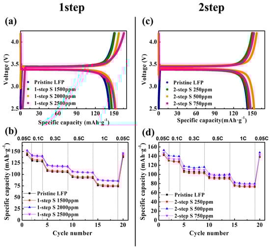 (a) Initial charge–discharge profiles and (b) discharge capacities at 0.05, 0.1, 0.3, 0.5, and 1 C rates for the pristine LFP and 1-step sulfur-modified LFPs. (c) Initial charge–discharge profiles and (d) discharge capacities at 0.05, 0.1, 0.3, 0.5, and 1 C rates for the pristine LFP and 2-step sulfur-modified LFPs.