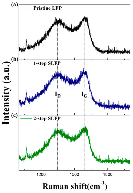 Figure 3 compares the Raman spectra of the 1-step and 2-step sulfur-modified SLFP with that of the pristine LFP. Raman spectroscopy is an effective technique for characterizing the carbon structure (including disorders and crystallite formation) of the coating layer owing to the strong scattering properties of carbon, with two E2g modes, predicted to be Raman active. The carbon structure of the coating layer significantly influences the LFP properties, as a higher proportion of graphitic carbon than the disordered carbon enhances the electronic conductivity. Figure 3 demonstrates broad peaks located at approximately 1342.8 and 1590.7 cm⁻1, which indicate the D and G bands of the carbon coating, respectively. The extent of graphitization and its ratio to disordered carbon is typically characterized by the ID/IG (intensity ratio of D and G bands) ratio in the Raman spectrum [35,36,37]. As shown in Figure 3a,b, the intensity of the G band in the Raman spectrum of the 1-step SLFP is slightly larger than that of the pristine sample.