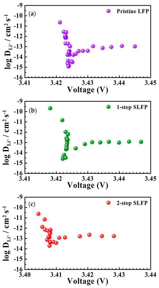 Li-diffusion coefficient (DLi+) values measured using the GITT method for (a) pristine LFP, (b) 1-step sulfur-modified SLFP, and (c) 2-step sulfur-modified SLFP.