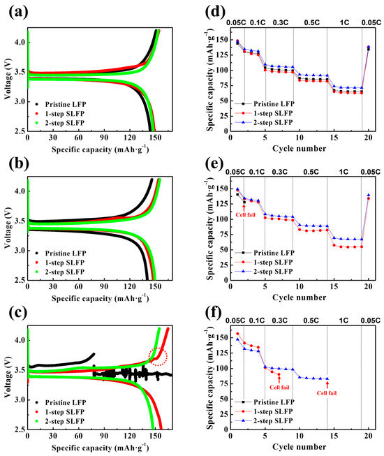 Charge–discharge profiles of the pristine LFP, 1-step sulfur-modified SLFP, and 2-step sulfur-modified SLFP after storage for (a) 7 days, (b) 10 days, and (c) 14 days. Discharge capacities at 0.05, 0.1, 0.3, 0.5, and 1 C rates for the pristine LFP, 1-step sulfur-modified SLFP, and 2-step sulfur-modified SLFP after storage for (d) 7 days, (e) 10 days, and (f) 14 days.