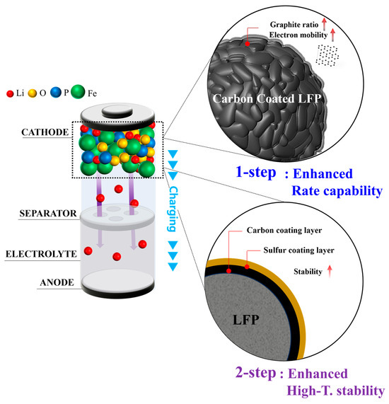 LiFePO₄ (LFP) cathodes are popular due to their safety and cyclic performance, despite limitations in lithium-ion diffusion and conductivity. These can be improved with carbon coating, but further advancements are possible despite commercial success. In this study, we modified the carbon coating layer using sulfur to enhance the electronic conductivity and stabilize the carbon surface layer via two methods: 1-step and 2-step processes. In the 1-step process, sulfur powder was mixed with cellulose followed by heat treatment to form a coating layer; in the 2-step process, an additional coating layer was applied on top of the carbon coating layer. Electrochemical measurements demonstrated that the 1-step sulfur-modified LFP significantly improved the discharge capacity (~152 mAh·g−1 at 0.5 C rate) and rate capability compared to pristine LFP. Raman analyses indicated that sulfur mixed with a carbon source increases the graphitization of the carbon layer. Although the 2-step sulfur modification did not exceed the 1-step process in enhancing rate capability, it improved the storage characteristics of LFP at high temperatures. The residual sulfur elements apparently protected the surface. These findings confirm that sulfur modification of the carbon layer is effective for improving LFP cathode properties, offering a promising approach to enhance the performance and stability of LFP-based lithium-ion batteries.