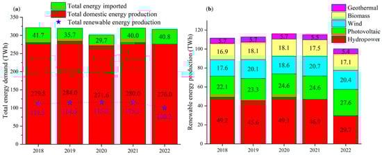 Italian electric energy production has changed across the years, driven by both national and international stimuli [23]. Since the pandemic era, ‘EU Next Generation’ and ‘EU Green Deal’ programs have committed Italian policies to sustainability advancements aiming to reduce the dependence on fossil fuels [24]. As shown in Figure 1a, during the last five years, the Italian energy demand reached a maximum of up to 321 TWh in 2018, with a reduction to 301 TWh during the first year of the COVID pandemic event. After the pandemic period, the energy demand went back to pre-pandemic levels, reaching 320 TWh in 2022. The main issue in the Italian scenario is that the amount of domestic energetic production available for consumption in the period 2018–2022 covered only around 87 ± 1% of the demand. These data identify Italy as an energy importer, suggesting that Italian energetic plans and administration cannot be decided and implemented without international negotiations with EU and non-EU partners [25]. This dependence upon energy imports represents a serious threat to the Italian system, but it is also a strong push towards the implementation of an alternative production supply based on renewable local resources, as reported in Figure 1a (blue dotted line). Electric energy production through renewable energy sources has covered up to 38% of the total demand in 2020, decreasing to 32% in 2022. As reported in Figure 1b, renewable energy sources are well differentiated, with a major role played by hydropower technology, representing around 40% of them in 2021. In 2022, renewable energy production was reduced with a decrement of around 20 TWh of hydropower related to climate factors and gas prices rising [26]. The market quota represented by the other sources did not sensibly change across the last five years, showing only minor fluctuations with the exception of photovoltaic, which has a slowing increase of around 5% a year.