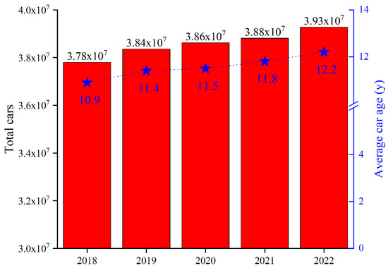 As shown in Figure 2, the Italian car fleet has constantly increased during the last five years, reaching 3.93 × 107 vehicles in 2022, and it is strongly related to the increment in average income [42]. The increase in car numbers has been discouraged with the incentive of public and alternative private mobility but with very limited appreciable results [43,44,45,46]. Burlando et al. [47] suggested that the increase in car numbers can be due to the poor awareness of the real cost of car ownership related to maintenance and taxes. At the same time, the average age of the cars increased from 10.9 years in 2018 up to 12.2 years in 2022, suggesting a progressive increment of car fleet obsolescence, increasing its carbon footprint [48] and pointing towards an increased reluctance of car owners to buy more modern, less impacting cars.