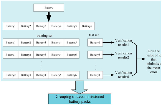 For each sample in the test set of retired battery packs, the KNN algorithm is used to find the nearest K proximity features, voting is performed according to the categories of proximity features, the samples are assigned to the category with the highest number of votes, and through the cross-validation method, different values of K are taken, and m-weight cross-validation is performed under each value of K. The value with the smallest average error is selected as the optimal solution to output the grouping decision.