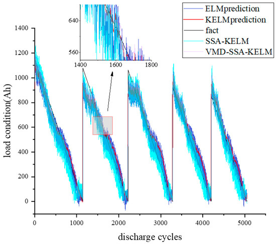 Figure 3 shows the process of five discharges of the battery pack. The horizontal coordinate is the process of battery discharge and the vertical coordinate is the battery load state (Ah); the blue line is the battery load state predicted by the ELM, the red line is the battery load state predicted by the KELM, the black line is the actual detected load of the battery, the light blue line is the battery load state predicted by the SSA-KELM, and the purple line is the battery load state predicted by the VMD-SSA-KELM. The consistency between the ELM prediction and the actual load state curve is low, and the consistency is the worst in the case of high load state, which is far lower than the actual value, and its prediction fluctuates up and down in a certain interval, and its prediction stability is poor, and it is more consistent with the actual load curve in the case of low load state. KELM is an extension of ELM, which introduces the kernel technique, and the results are similar to ELM. The kernel technique is more effective in dealing with the nonlinear relationship, which greatly reduces the volatility of the predicted values, and the prediction stability is significantly improved, but the consistency of the model with the actual load curve is still poor in the case of high load state, and it is much lower than the actual curve. VMD-SSA-KELM combines the advantages of VMD, SSA, and KELM, and performs the best in dealing with complex nonlinear battery compliance prediction. Although it still cannot overcome the large periodic error in the discharge cycle, it improves the stability of the prediction and reduces the prediction error. The prediction of the battery state for retired battery packs applies to a lower load state, so the present method is more relevant for the prediction of the maximum load state or the battery life of the retired battery packs’ batteries.