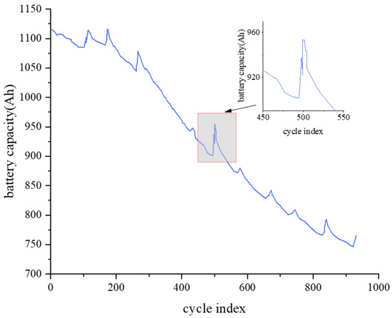 Figure 4 shows the relationship between the actual capacity of the battery and the number of charge/discharge cycles. The capacity of the battery decreases significantly with the increase in the number of charge/discharge cycles of the battery, which shows that the capacity of the battery has an obvious correlation to the prediction of the battery’s life, and also further verifies the correctness of selecting the capacity of the battery as the health factor in this paper. Its aging rate can be estimated by calculating the percentage decrease in capacity between the number of consecutive cycles. Locally, there is an obvious abrupt change in battery capacity with an increase in battery charging and discharging cycles, which is due to the short-term rebound of capacity in the resting phase of the battery, which is a normal capacity regeneration phenomenon. The bumps appearing in the graph of the number of cycles can be well avoided by sorting all the capacity values of all the cycles from smallest to largest and finding the ones located in the middle.
