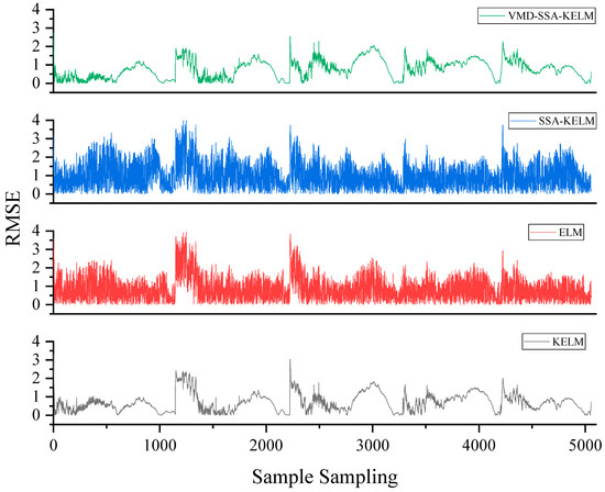 KELM: The RMSE of this method is 3.28 at sample number 1, 2.4 at sample number 1150, 2.96 at sample number 2229, 1.6 at sample number 3306, and 1.9 at sample number 4425. The error decreases with an increase in sample number and becomes constant at a certain interval, which indicates that the method has higher prediction stability and a smaller error as more battery discharge samples are collected. There is also a periodic increase in the error, and the main node of the increase occurs when the battery pack is in a higher load state in the early stage of battery discharge. Comparing the KELM prediction errors before and after VMD and SSA optimization, the optimized prediction shows a reduction in the fluctuation interval, improved prediction stability, and a reduction in the cyclical prediction error. It can be seen that the relative prediction error of each method is larger in the case of higher battery loads, and after optimization using the SSA algorithm, the error is further reduced and the prediction stability is high, which makes it more suitable for the prediction of the degradation in decommissioned battery pack performance.