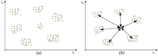 Figure 6 shows a schematic diagram of the battery pack reorganization allocation strategy with X1 as the horizontal axis and X2 as the vertical axis, which represents the distances of each eigenvalue in a two-dimensional planar projection. To calculate this, we determine the number of lithium batteries acquired for classification, determine the group with the lowest number of batteries in the grouped pack, calculate the Euclidean distance between this group and the center of other groups, select the group with the smallest Euclidean distance as the group for removing a single lithium battery, and calculate the Euclidean distances between the features of the center point of the group with the smallest number of lithium batteries and the individual feature points in the group with the smallest Euclidean distance and as the group with the removal of each lithium battery after the clustering of the lithium battery group. The Euclidean distance is sorted, and cells with the smallest distance are moved sequentially from the removed group to the group with the fewest cells, until reaching the rated number in the clustered group.