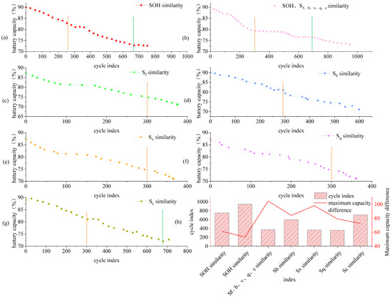 Effect of different grouping strategies. Figure (a–g) represent the grouping strategies based on the overall weight distribution balance of SOH, Sf,b,v,q,c; where SOH-weight-biased grouping strategy, Sf-weight-biased grouping strategy, Sb-weight-biased grouping strategy, Sv-weight-biased grouping strategy, Sq-weight-biased grouping strategy, and Sc-weight-biased allocation strategy, respectively. Figure (h) illustrates the impact of different clustering strategies on the cycle count and maximum capacity difference of the batteries.
