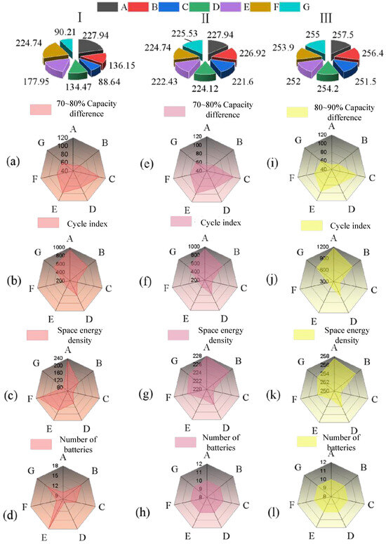 Three-dimensional Evaluation Results. Group (I) illustrates the maximum capacity deviation in battery pack groups under different grouping strategies including (a–d); (II) are the number of charge–discharge cycles in battery pack groups under different grouping strategies including (e–h); (III) illustrates the spatial energy density within battery pack groups under different allocation strategies including (i–l).