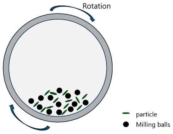 Figure 1 illustrates the appearance of balls and particles inside the chamber during ball milling. Ball milling is a complex process used to obtain nanostructured materials in powder form with an average particle size of less than 100 nm [70]. In addition, ball milling is a suitable method for large-scale production. This involves the high-speed collision of stainless steel or zirconia balls, which reduces larger particles to finer ones and promotes the formation of new bonds [71]. A ball mill consists of a cylindrical chamber that rotates around the horizontal axis. Generally, ball milling is used by filling the chamber with small balls made of materials such as iron or zirconia. The inside of the chamber is made of materials such as iron and rubber to prevent wear. Ball milling can be performed for approximately 100 to 150 h and can yield sized fine powders. It is characterized by the ability to maintain a vacuum or a specific gas atmosphere within the chamber. In addition, it offers the advantage of enabling ceramic nano-reinforcement [72]. This section presents the formation and analysis of silicon–carbon composites via ball milling, as investigated in a previous study [73,74,75].