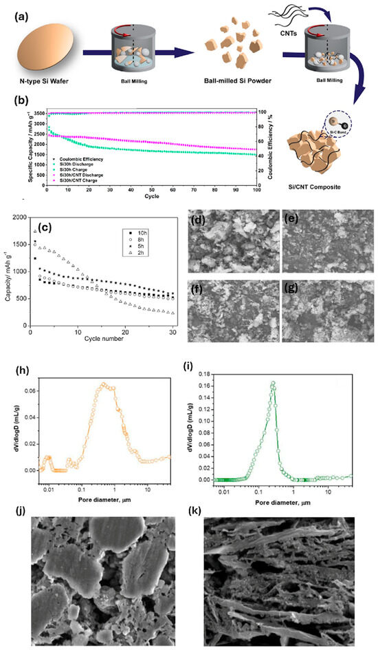 (a) Synthesis of Si/CNT; (b) cycle performance of Si/CNT [76] Reprinted with permission from Ref. [76]. Copyright © 2022 MDPI). (c) Ball milling of Si/C for (d) 2 h, (e) 5 h, (f) 8 h, and (g) 10 h [77] Reprinted with permission from Ref. [77]. Copyright © 2010 Elsevier. Pore distribution in (h) dry ball milling and (i) wet ball milling and SEM images of Si/C produced by (j) dry ball milling and (k) wet ball milling [78]. Reprinted with permission from Ref. [78]. Copyright © 2020 MDPI.