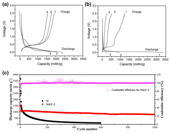 Wang et al. [88] employed nanosilicon and phenolic resin to fabricate Si/C composites via pyrolysis. Due to the desirable electrochemical properties of pyrolyzed carbon, phenolic resin was selected as the carbon source, which exhibits a reversible capacity of approximately 400 mAh/g and exhibits outstanding cycle performance. Cyclic voltammetry (CV) curves of the synthesized composites were analyzed to assess their electrochemical behavior. The cyclic voltammetry (CV) curves of pure Si and the Si/C composite are shown in Figure 6a,b, respectively. In the early phase cathodic scans of both materials, a distinct reduction peak was observed in the range of 0 to 0.2 V, which likely indicates the transformation of silicon from a crystalline to an amorphous phase. Additionally, the formation of an SEI layer on the electrode surface was indicated by an irreversible cathodic peak observed in the range of 0.5 to 0.75 V. This peak disappeared after the first cycle. For Si nanoparticles, two peaks were observed at approximately 0.32 V and 0.54 V during the first anodic scan, which are associated with the dealloying of Li-Si. Conversely, for the Si/C nanocomposite, the observed anodic peak at approximately 0.25 V suggests that a significant portion of the silicon transitioned to an amorphous LixSi phase. Additionally, the Si/C nanocomposite exhibited significantly larger current peaks than the Si nanoparticles, indicating that the lithium ions migrated more effectively into the silicon within the Si/C composite than in the pure Si. Figure 6c,d shows the voltage profiles of pure Si and the Si/C composite, which align with the CV results. In the delithiation process of pure Si, distinct plateaus are observed at 0.32 V and 0.54 V (Figure 6c). In contrast, the Si/C composite exhibits a voltage slope at approximately 0.25 V (Figure 6d), indicating that a greater portion of Si has transitioned to the amorphous LixSi phase compared to pure Si. Additionally, while pure Si shows a dramatic capacity decrease with a large overpotential, the Si/C composite demonstrates better capacity retention and similar voltage profiles over 50 cycles.