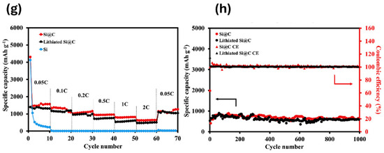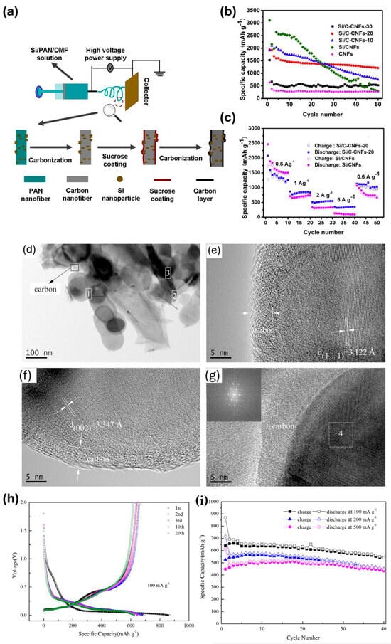 Chen et al. [84] produced carbon nanofibers (CNFs) through pyrolysis using polyacrylonitrile (PAN). Silicon and carbon nanofibers (CNFs) were used to produce Si/CNFs, which were heat-treated with sucrose to produce Si/C-CNFs (Figure 5a). The samples were designated as Si/C-CNFs-10, 20, and 30 based on the amount of sucrose used. Figure 5b shows the cycling performances of CNFs, Si/CNFs, Si/C-CNFs-10, 20, and 30 at a current density of 600 mA/g. The discharge capacity of the Si/CNF composite rapidly decreased to 293.8 mAh/g after 50 cycles. This decrease was due to the volume change in the Si particles, which crack and fracture and loses electrical contact with the CNF. Consequently, the capacity decreased as many Si particles became unavailable for lithium-ion interactions during the lithiation and delithiation. In contrast, the Si/C-CNFs composite exhibited enhanced cycling stability compared to the Si/CNFs composite. Specifically, Si/C-CNFs-20 maintained a discharge capacity of 1215.2 mAh/g even after 50 cycles, thereby minimizing the capacity loss. This improvement is attributed to the carbon coating, which mitigates the volume expansion of Si and maintains the structural stability of the electrode. The Si/C-CNFs-30 composite showed stable performance in the second cycle, but the overall capacity was relatively low at 500 mAh/g compared to the other composites. The reason for the decreased capacity is that the excessively thick coating layer allows fewer silicon particles to react with the lithium during the lithium-silicon alloying/dealloying process. Nevertheless, the carbon coating helps establish pathways between the nanofibers for lithium-ion transport, thereby enhancing the rate of performance. Consequently, the Si/C-CNFs-20 electrode demonstrates markedly improved rate capability compared to the Si/CNFs electrode (Figure 5c). Si/C-CNFs-20 had a capacity of approximately 350 mAh/g at a current density of 5000 mA/g. When the current density was decreased to 600 mA/g, the capacity was recovered to approximately 1200 mAh/g. The cycling performance of the CNF anode at 600 mA/g revealed a capacity of below 300 mAh/g. Yang et al. [85] utilized nano-Si, graphite, and coal tar pitch as precursors to form Si/C composites in two stages: heat treatment and pyrolysis. A comparative analysis was conducted based on the primary pyrolysis temperature. Heat treatment was conducted at temperatures of 0 °C (no treatment), 120 °C, 180 °C, and 200 °C. The S180 composite, treated at 180 °C, displayed an irregular morphology with silicon and carbon elements evenly distributed across the particle surfaces, suggesting that all raw materials were well-dispersed within the composite carbon layers, graphite, and silicon, all of which were observed as amorphous. This was because the pitch filled these voids at temperatures exceeding the glass transition temperature (Tg). Hu et al. [86] used nanosilicon and PAN to synthesize silicon–carbon composites via oxidative pyrolysis. The process was carried out at temperatures of 250, 300, 350, and 400 °C for 30 min. It is important to note that temperatures above 350 °C pose a risk of oxidation of the copper current collector, potentially leading to the formation of Cu2O, which would contribute to the capacity but is not desirable for accurate electrochemical analysis. The electrode treated at 250 °C showed a discharge capacity of 630 mAh/g at the 10th cycle, which dropped to nearly 0 after the 60th cycle. Increasing the processing temperature to 300 °C significantly enhanced performance, yielding a discharge capacity of 1415 mAh/g at the 10th cycle and maintaining a capacity of 1132 mAh/g after 100 cycles. This represents a marked improvement compared to the electrode processed at 250 °C. The Si/C composite thermally treated at 400 °C had a capacity of more than 2000 mAh/g up to 60 cycles and a capacity of 1555 mAh/g up to 100 cycles. It has a retention rate of approximately 78%. This improved performance is due to the high amount of silicon and high current density. The Si/C composite fabricated at high temperatures exhibited superior rate capability. The composite annealed at 250 °C performed the worst among the other composites, while the composite exhibited at 400 °C performed the best. Under 3C cycling conditions, the sample that was treated at 400 °C showed an impressive discharge capacity of approximately 500 mAh/g, whereas the other samples exhibited negligible capacity. When the C-rate was returned to C/10, most of the composites achieved a capacity of 3000 mAh/g, demonstrating that the electrodes could recover their original capacity after cycling at a high C-rate. Su et al. [87] synthesized Si/C composites by pyrolyzing nanosilicon and flake graphite phenolic resins. Figure 5d shows that the synthesized Si/C composite particles were notably small. 1, 2 and 3 in Figure 5d are shown in Figure 5e, Figure 5f and Figure 5g, respectively. Figure 5d–g presents a detailed examination of the particle structure of the Si/C composite. Nanosilicon was uniformly distributed within the graphite matrix, whereas the carbon derived from phenolic resin pyrolysis coated the surface of the Si/graphite structure. This carbon coating effectively alleviated the volumetric expansion of Si. The electronic conductivity of the anode was also improved by coating it with carbon. Figure 5g shows a Fourier transformation of Region 4 from a High-Resolution Transmission Electron Microscopy (HRTEM) image, which indicates that lattice distances in both directions are well in agreement with interlayer distances of Si and lamellar graphite. This showed that the graphite and nanoscale Si powders were thoroughly dispersed. Figure 5h shows the capacity according to the cycle of the Si/C composite at 100 mA/g. The initial capacities were 867.6 and 640.5 mAh/g, respectively, with an ICE of 73.82%. In the early stages of insertion, the observed plateaus are mainly due to Li-allo