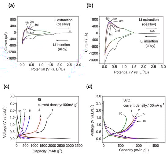 Cyclic voltammetry curves of (a) pure Si and (b) Si/C composite. Voltage profiles of (c) pure Si and (d) Si/C composite in 1, 2, 5, 10 and 50 cycles. [88] Reprinted with permission from Ref. [88]. Copyright © 2013 Elsevier.