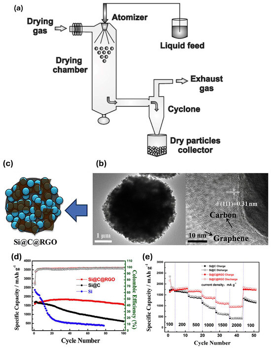 (a) Schematic of the spray drying process [90] Reprinted with permission from Ref. [90]. Copyright © 2015 Elsevier. (b) TEM of the Si@C@RGO composite. (c) Schematic of the Si@C@RGO composite, (d) cycle performance of the composites and pure Si, and (e) C-rate capability of the composites [91] Reprinted with permission from Ref. [91]. Copyright © 2017 Elsevier.