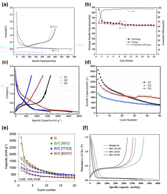 Lai et al. [92] adopted graphite and glucose as the carbon sources of silicon–carbon composites. They employed spray drying to produce spherical Si/C composites. Figure 8a,b illustrates the electrochemical performance according to the cycle of the previously prepared Si/C composite. The characteristics of this composite material showed a high initial CE of 69.71%. As the SEI layer is formed in the initial cycle, irreversible capacity occurs at about 0.8 V due to lithium consumption. After that, it showed a CE of 96% and an excellent performance with a capacity of 552 mAh/g in the 20th cycle. Su et al. [93] used spray drying of silicon and graphene to synthesize Si/C composites. The composites prepared with silicon and graphene in ratios of 1:2, 1:4, and 1:6 were labeled G1, G2, and G3, respectively. Figure 8c,d shows the performance of composite materials synthesized with different ratios of silicon and graphene. Figure 8c presents the voltage profile of the initial cycles of the Si/C composites with different proportions at a current density of 100 mA/g. Like the previous group, this group’s study also showed a significant slope due to the formation of the SEI layer at 0.6~0.8 V. The Si/C composite showed a plateau of about 0.1 V. This is because the SEI layer was formed in the initial discharge stage, a stable film was formed and operated. The plateau of about 0.45 V on the charging curve is the release of some silicon. The charge–discharge curves of different proportions of silicon–carbon composites show similar curves. In the initial cycle, the capacity values of each Si/C composite were 2662.4, 2869.9, and 1671.5 mAh/g. This means that the inclusion of graphene improves the capacity. Figure 8d illustrates the cycle performance of Si/C composites at a current density of 100 mA/g. The capacity of the Si/C composite cell decreased as the cycle progressed. Among the composite materials, the capacities of the composite material with a graphene ratio of 2 times and 6 times greater than silicon were 323.2 mAh/g and 298.6 mAh/g, respectively, and the composite material with a capacity of 4 times greater than silicon showed the best performance with a capacity of more than 600 mAh/g. Carbon with a relatively low carbon content does not seem to be able to improve the conductivity and volume of silicon; on the contrary, the composite material with a high carbon content does not seem to be able to use a high capacity of silicon due to a lot of carbon but rather to increase the resistance. Paireau et al. [94] used silicon and polyvinyl alcohol (PVA) to produce Si/C composites via spray drying. PVA was chosen as the carbon source because of its water solubility, which makes it an environmentally friendly option. After manufacturing the Si/C composites with the selected materials, different Si/C ratios were used for the charging–discharging cycle tests. Figure 8e shows the results for pristine silicon and Si/carbon composites with Si/C ratios of 98:2, 77:23, and 63:37. The low irreversible capacity, an initial problem with silicon–carbon composites, decreased as the carbon content increased. As a result, ICE increased. Although the carbon addition was improved over pure Si, no significant cycle performance improvement was observed. Each Si/C composite material decreased dramatically in capacity during the initial cycle and then stabilized. This decrease in capacity became less pronounced as the carbon content increased. However, even when the carbon content increased to 37 wt%, a significant capacity loss still occurred. The carbon content increased to 37 wt%, but as a result, it performed worse than expected. This suggests that the excess carbon did not improve the low conductivity of the silicon particles, but rather served as a resistive layer. Wang et al. [95] manufactured Si/C composites by spray drying, and citric acid was adopted as the carbon source. Citric acid was used at concentrations of 1.25, 2.5, and 3.5% by weight to produce different Si/C composites. Figure 8f displays the voltage profiles for pristine Si and Si/C composites with different amounts of carbon. Pristine Si has an ICE of 80%, and the initial reversible capacity is 3960 mAh/g and 3180 mAh/g. Si/C composites ranged from 2210 to 2710 mAh/g, but a composite with a carbon content of 1.25% among the prepared Si/C composite showed 84% with higher ICE values than pristine Si. This is because carbon is dispersed between Si particles, improving the low conductivity of silicon and increasing the stable SEI layer.