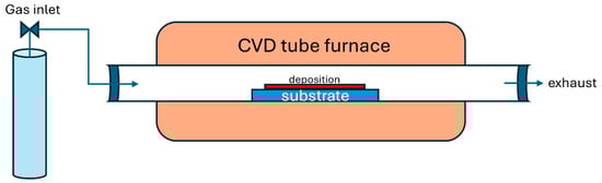 Chemical vapor deposition (CVD) equipment is shown in Figure 9. CVD is a technique that is widely used for the growth of materials that are used in a variety of electronic and optoelectronic devices, chemical sensors, nanocomposites, and energy storage systems. In CVD, gaseous reactants are transported through a tube furnace where they decompose to generate atomic or molecular species. These species are then deposited on the surface of the substrate. CVD is primarily employed to produce graphite carbon-coated silicon and carbon nanotubes. Moreover, it can be used to deposit silicon onto substrates using precursors such as SiH4 or SiHCl3 [96]. The composite structure produced by CVD varies with changes in temperature and gas flow rate. As the temperature increases in CVD, the deposition yield also rises. This occurs because higher deposition temperatures enhance chemical kinetics and lead to a more structured atomic arrangement during crystal growth. As the gas flow rate increases, the amount of deposition also rises. However, as deposition increases, resistance also escalates, leading to a deterioration in performance. Therefore, it is essential to adjust the gas flow rate to an appropriate level [97,98]. Based on this principle, the CVD method was used to synthesize Si/C composites, followed by a comprehensive evaluation of their performance.