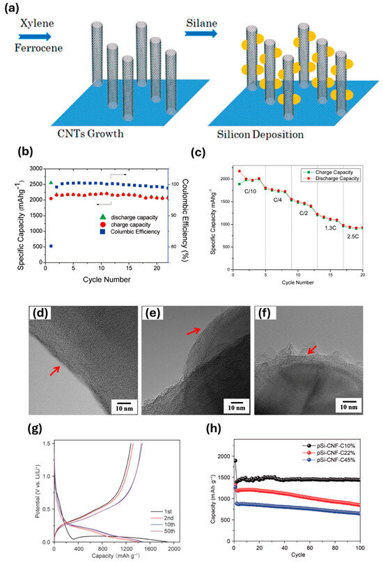 Wang et al. [99] developed nanoscale Si/C composites utilizing a dual-step CVD process. Following the procedure depicted in Figure 10a, xylene (C8H10) was employed as the source of hydrocarbons and iron produced by decomposition at high temperatures using ferrocene (Fe(C5H5)2) as a catalyst to promote the production of multi-walled carbon nanotubes (MWNTs). Subsequently, silane gas was introduced to deposit Si on the MWNTs, completing the fabrication process. The Si/C ratio was determined after calculating by measuring the substrate by adjusting the parameters. The cycling performance of Si/CNT is shown in Figure 10b. The initial reversible capacities were 2552 and 2049 mAh/g, showing an ICE of 80.3%. It shows a capacity loss of 19.7%. In the subsequent cycle, the reversible capacity increased due to the activation of additional silicon atoms, and the CE was improved to 99%. It is shown that the electrode is stabilized by the formation of a stable SEI. Figure 10c shows the charge/discharge capacity at various current densities. As can be seen in the figure, this composite material showed higher capacity and stable performance with a capacity of about 1000 mAh/g at a C-rate of 2.5C than graphite, which is a commonly used cathode material. This performance is a result of the effect of the silicon/CNT nanostructure to reduce particle aggregation and manage volume change. In addition, the improved electronic conductivity and mechanical strength provided by the CNTs contributed to these results. Fu et al. [100] used nanostructured Si and carbon nanofibers (CNFs) to form Si/C composites. PAN was employed as the carbon precursor, and CVD was employed to deposit a carbon coating on the silicon surface, resulting in a Si/CNF-C composite. During the process, acetylene (C2H2) was used as the carbon source for deposition. In order to prevent detachment between the nanofiber surface and silicon, Si@CNF composite material manufacturing adopts CVD technology. The Si@CNF-C composites were analyzed by varying the CVD coating time. Figure 10d–f shows high-magnification TEM images of composites with different CVD treatment times. In the figure, a red arrow indicates the carbon coating layer formed during the CVD. The SEI layer depends on the type of carbon coating of the particles. Si/CNF-C composites were effective in forming an SEI layer with a stable carbon coating layer. As a result, ICE was improved positively. In addition, the electrochemical performance of the composite material coated with CVD for 90 min was remarkably improved. Si/CNF composites and Si/CNF-C composites were compared to confirm the effect with or without additional carbon coating. Si/CNF without carbon coating showed a capacity retention rate of 65% after the 30th cycle and the charging capacity decreased to 570 mAh/g. In contrast, all Si/CNF-C composites demonstrated improved performance, retaining approximately 76% of their capacity and achieving approximately 700 mAh/g after 30 cycles. This result is the exfoliation of Si attached to carbon nanofibers due to the volume change in Si in the Si/CNF composite. In contrast, the CVD-coated Si/CNF-C composite effectively mitigated the volumetric changes in Si, thereby improving the structural integrity and performance of the composite. Jin et al. [101] adopted porous silicon (pSi) and carbon nanofibers (CNFs) and synthesized Si/C composites through CVD using Fe-Ni as a catalyst. Consequently, the Si/C composite particle size of the composite ranged from 5 to 20 μm, and the CNFs were uniformly coated. Figure 10g shows the voltage profile curve for each cycle of the composite. The porous silicon–carbon nanofiber (pSi-CNF) electrode showed capacities of 1895 mAh/g and 1282 mAh/g in the first cycle, indicating an ICE of 67.7%. The use of silicon-based anode materials has been observed to result in an almost low ICE. This is primarily due to its high reactivity with Li+, which results in an electrochemical side reaction, such as the formation of Li2O or Li4SiO4. In this process, the electrolyte is decomposed, and Li+ is consumed. This phenomenon is commonly observed during the initial cycle. In the initial lithiation of pSi-CNF, a voltage plateau was observed at 0.1 V, indicating that lithium had alloyed with silicon. During the initial charging phase, a plateau was observed at 0.5 V. The conversion of the material into amorphous Si is achieved through dealloying of the Si component, which occurs subsequent to its alloying with Li ions. In the subsequent cycle, a capacity of approximately 1300–1400 mAh/g was observed, accompanied by stable performance. Figure 10h shows the electrochemical behavior of Si/C composites with varying carbon contents. The initial capacities of each pSi-CNF-C composite material with CNF contents of 10, 22, and 45% were 1971, 1321, and 1270 mAh/g, respectively. The ICE values were 67.1, 65.0, and 60.3%. Furthermore, the capacity based on 100 cycles exhibited a tendency to decrease, reaching 1441, 848, and 648 mAh/g. This is attributed to the fact that an elevated CNF content results in a greater resistance layer, leading to an increased consumption of Li+ during the SEI formation process. This contrasts with the desired outcome of establishing a conductive network.