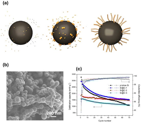 Liu et al. [102] synthesized a silicon nanowire (SiNW)/spherical graphite (GM) composite (C@SiNW@GM) in which silicon was deposited on spherical microsized graphite using CVD and an additional carbon layer was formed using acetylene. Figure 11a illustrates the process of gas-phase Si deposition onto micro-sized spherical graphite, which subsequently transforms into SiNWs. As the CVD processing time increased, the silicon transitioned into silicon nanowires. Nucleation of silicon was formed by flowing SiH₄ or SiHCl₃ into the gas phase. According to the C@SiNW@GM composite electrochemical behavior reported at a current density of 0.2C, the section decreasing from 1.0 V to 0.5 V during the first discharge shows a reduced slope due to the formation of SEI. Subsequently, a stable plateau was observed during the subsequent cycle, which can be attributed to the electrochemical reaction of graphite and Si. Jinglu et al. [103] carbonized toluene at 800 °C to coat the surface of silicon particles with carbonized carbon through a CVD process. Toluene was chosen because of its ability to decompose at this temperature and form a coating on the surface of the silicon particles. The composites were prepared by performing CVD treatments at 800 °C for durations of 1, 2, and 3 h. These composites were labeled Si@C-1, 2, and 3, respectively. Figure 11b shows the structure of the Si@C-2 composite, which exhibited the most stable performance among the various composites. The particle distribution of the pristine Si was primarily in the range of 50–200 nm. The particle sizes of Si@C-1, 2, and 3 exhibited an increase of 7 nm, 12 nm, and 15 nm, respectively, which can be attributed to the carbon deposition process through CVD, resulting in an enlargement of the composite particle size. Additionally, the results of electrochemical behavior for pristine Si, Si@C-1, 2, and 3 indicate the polarization increased with higher carbon content. Consequently, the resistance rises in conjunction with the expansion of the carbon layer, which functions as a resistance layer in itself. Figure 11c shows the cycling performance analysis of each composite electrode, along with that of the pristine Si electrode. Initially, Si@C-1 exhibited a rapid decrease in capacity. This was likely due to its lower carbon coating content, which provided insufficient mitigation of the volumetric expansion. In contrast, composites with high carbon coating contents had relatively low cycle performance due to increased voltage polarization during charging/discharging. The ICE values of the Si@C-1, 2, and 3 composites were found to be 83.6%, 80.1% and 78.9%, as indicated in the results. This indicates that the carbon content affects the CE, with a higher carbon content leading to a lower efficiency. This is because the amorphous carbon structure tends to trap the inserted lithium, thereby consuming more lithium and reducing the overall CE.