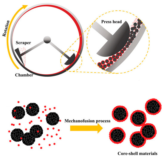 Figure 12 illustrates the configuration and interparticle interactions involved in the mechanofusion process. The configuration includes a press head, scraper, and chamber. In a mechanofusion system, the chamber rotates to generate a centrifugal force [104]. This centrifugal force causes the powders to converge and move between the press head and the inner wall of the chamber. Through this process, the powders experience friction and collisions between particles, causing small particles to stick to the surface of the large particles and disperse them [105]. To produce core-shell structured particles using mechanofusion, it is essential to use particles of different sizes: larger particles for the core and smaller particles for the shell. Owing to the continuous application of the centrifugal force, the powders adhere to the chamber walls. The scraper is responsible for removing the powder attached to the inner wall of the chamber due to centrifugal force. The mechanical composite formation was achieved by continuously repeating this process. Mechanofusion offers the advantage of coating particles without the need for solvents or other substances [106].
