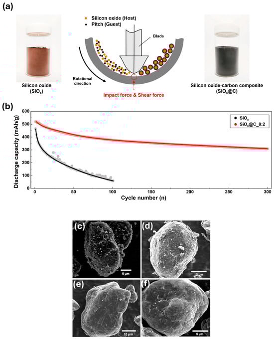 Kim et al. [107] fabricated SiOx@C composites via mechanofusion with silicon oxide and pitch, as shown in Figure 13a. In this process, the silicon oxide (SiOx) that has relatively large particles was structured as a core, while the pitch, which is a smaller particle, forms a shell structure. During the manufacturing process, the rotation of the chamber generated high temperatures that surpassed the softening point of the pitch, allowing for an effective coating. In order to confirm the effect of carbon coating, a performance evaluation was conducted, comparing the SiOx@C composite material with pure SiOx. The SiOx@C composite material demonstrated superior performance compared to the SiOx electrode, which was attributed to the carbon coating. Although the SiOx@C composite initially exhibited a CE of 60%, the SiOx electrode achieved a CE of only 12.6% after the 100th cycle. In addition, while the SiOx electrode reached a CE of 99% by the 10th cycle, the SiOx@C composite achieved the same efficiency by the 4th cycle. As a result of further evaluating the rate capability, the SiOx@C composite material showed a capacity retention rate of 77.2% at 0.5C and a lower capacity retention rate of 47.8% for the SiOx electrode. It was found that the carbon coating at the SiOx@C composite site contributed to the mitigation against volume change in Si and the formation of a stable SEI layer. Cao et al. [108] used mechanofusion to fabricate Si-alloy/graphite composites. The composite is distinguished by the silicon alloy embedded within the layered structure of graphite. The capacity exhibited at a high C-rate was approximately 900 mAh/g to 950 mAh/g. Consequently, it was established that the graphite layer facilitated the mitigation of the volume change in the silicon alloy. Jiang et al. [109] used mechanofusion to incorporate nanosilicon into graphite pores, followed by carbon coating to create a nanosilicon/graphite composite (n-Si/graphite). In this structure, Si served as the guest particle, whereas graphite acted as the host matrix. Figure 13c–f shows the SEM images of the mechanofusion process conducted on the composite for 1, 2, 3, and 5 h, respectively. These images illustrate the morphological changes in the particles over time. After 1 h (Figure 13c), the large particle was graphite and the small particle was n-Si. It has been established that the smaller particles are capable of adhering to the surface of the larger particles. After 2 h (Figure 13d), the n-Si particles became less discernible, and the graphite particles began to adopt a more spherical shape. After 3 h (Figure 13e), the graphite surface became smoother. Finally, after 5 h (Figure 13f), the bright spots in the image represent n-Si particles, and no further changes were observed in graphite particles. Wutthiprom et al. [110] used SiO2 and carbon nanospheres to create a SiO2@C composite through mechanofusion. Subsequently, a reduction process was employed to introduce porosity into the composite, thereby obtaining Si@C composite. The choice of SiO2 as the precursor for silicon was motivated by its cost-effectiveness, being approximately 3000 times cheaper than nanosilicon. This renders the process economically advantageous. The electrochemical behavior of the Si@C composite material prepared by this method was confirmed. Regarding the C-rate performance (Figure 13g) of the Si@C composite material, the ICE was 33.8% and the discharge capacity was 4308 mAh/g. Subsequent increases in the C-rate resulted in a decreasing trend in performance. However, the capacity recovered to 1259 mAh/g at 0.05C. This was initially unstable due to the formation of the SEI layer at the beginning. In comparison, pure Si demonstrated 25.5% ICE. These low ICE lack a stable carbon layer, resulting in the formation of an unstable SEI layer. The pre-lithiated Si@C composite electrode (Figure 13h) exhibited 98.8% ICE due to the stable SEI layer.