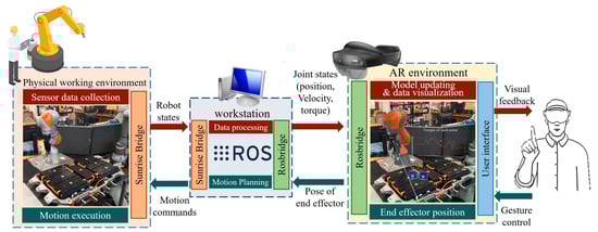 The system proposed in this paper integrates the advantages of AR and DT technologies. As illustrated in Figure 1, the system architecture encompasses the creation and registration of a digital replica of a physical robot within an AR environment. This setup not only facilitates real-time representation of the robot’s state but also enables user interaction with the virtual robot through intuitive gesture controls, thereby allowing remote control of the physical robot.