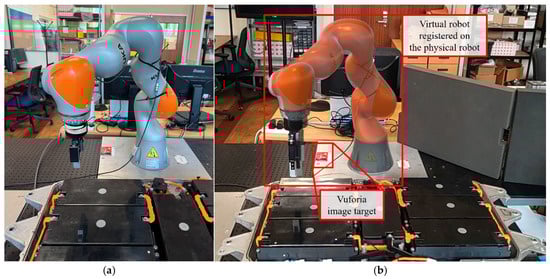 The physical robot and virtual robot. (a) Physical robot in the physical environment; (b) virtual robot registered on the physical robot by using the Vuforia image target.